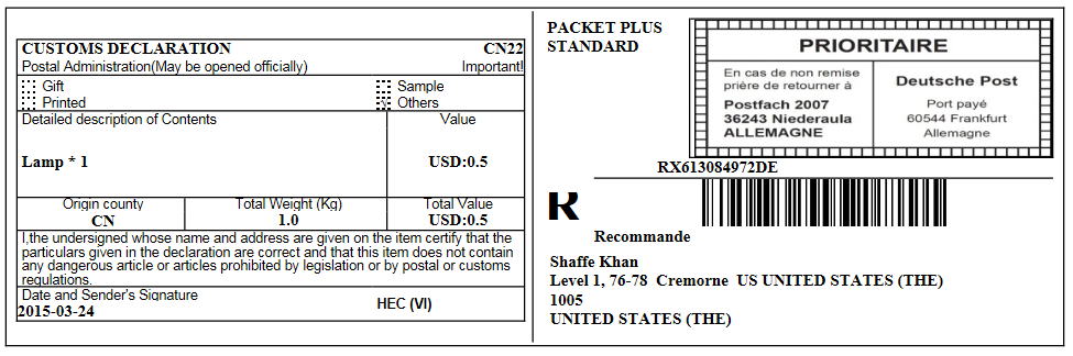 1、德国小包报关单填写和面单要求: 德国邮政小包只能贴德国邮政格式的报关单,不能贴香港邮政或中国邮政的报关单,地址面单模板也是服务商指定的模板,方便辨别提高货物的操作效率,客户发货前可以提前向我司小包客服部咨询。面单样板如下图:二、面单模板和轨迹跟踪