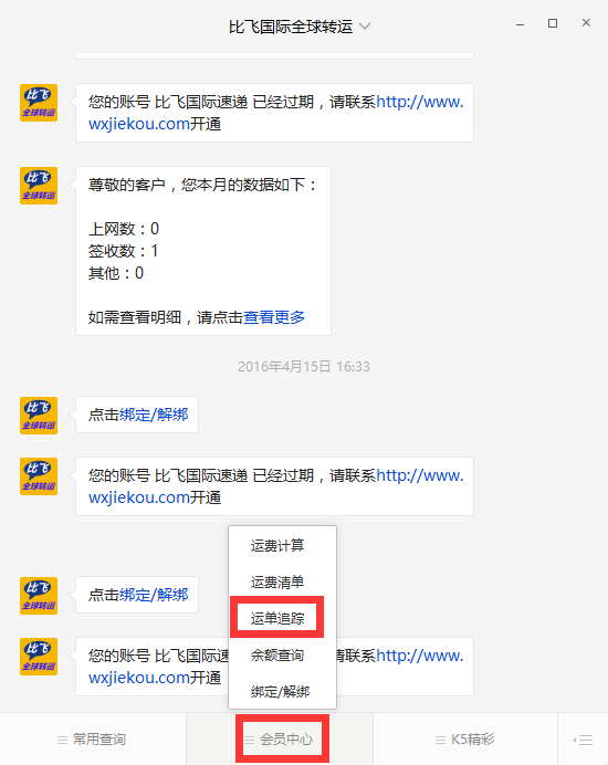 点击【会员中心】里的子菜单【运单追踪】即可。